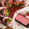 En lækker chokolade-hindbær cheesecake, lavet med hjemmelavet hindbærkompot, toppet med chokoladeganache, flødeskum og chokoladeovertrukne jordbær!