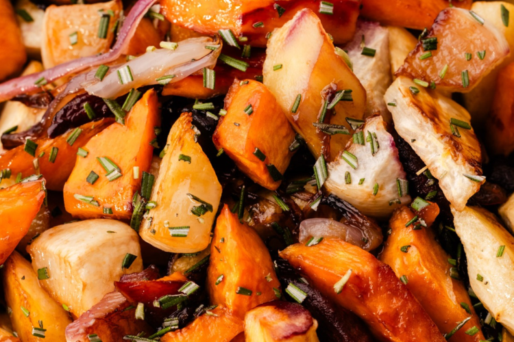 - På en bageplade blandes gulerødder, pastinakker, sød kartoffel, kålroe, jordskok, løg med olie drysses med salt.